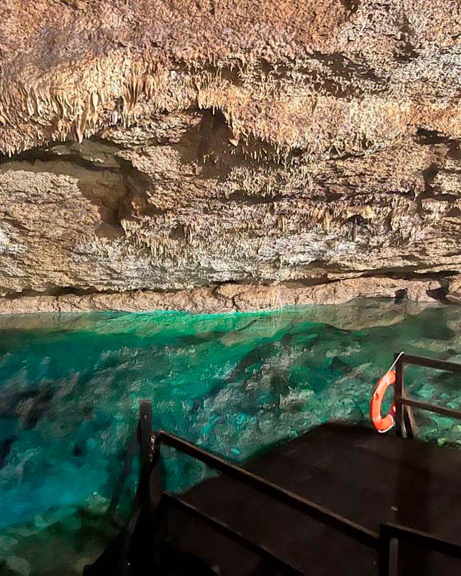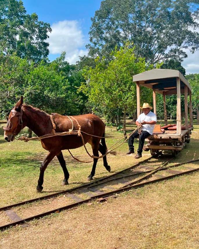 Afterwards you will ride on a wooden platform called a truk on rails pulled by a mule around the hacienda where you will see a typical Mayan house on the outskirts of the hacienda and then make a final stop at the cenote where you can swim in its crystalline waters and refresh yourself.